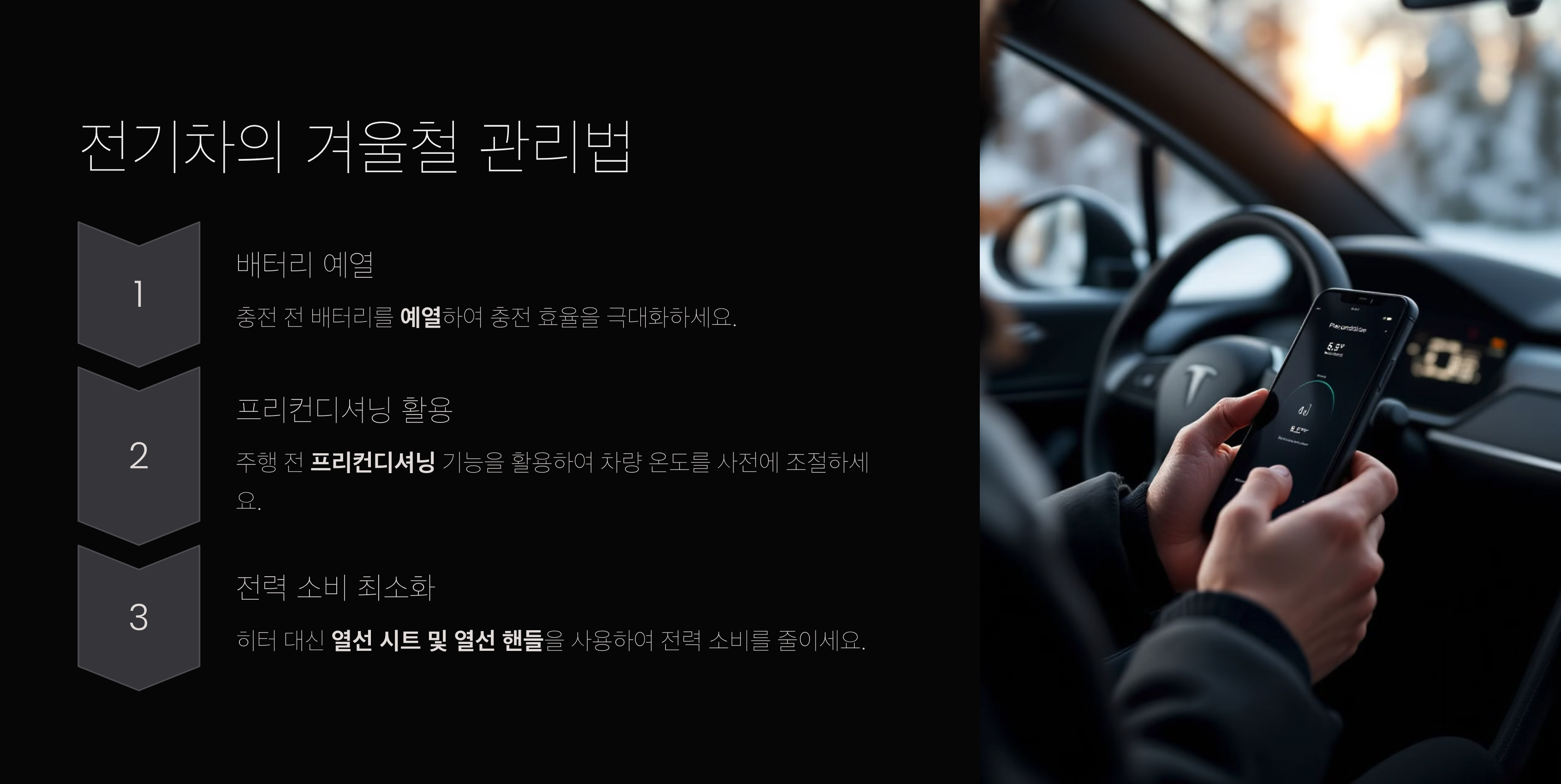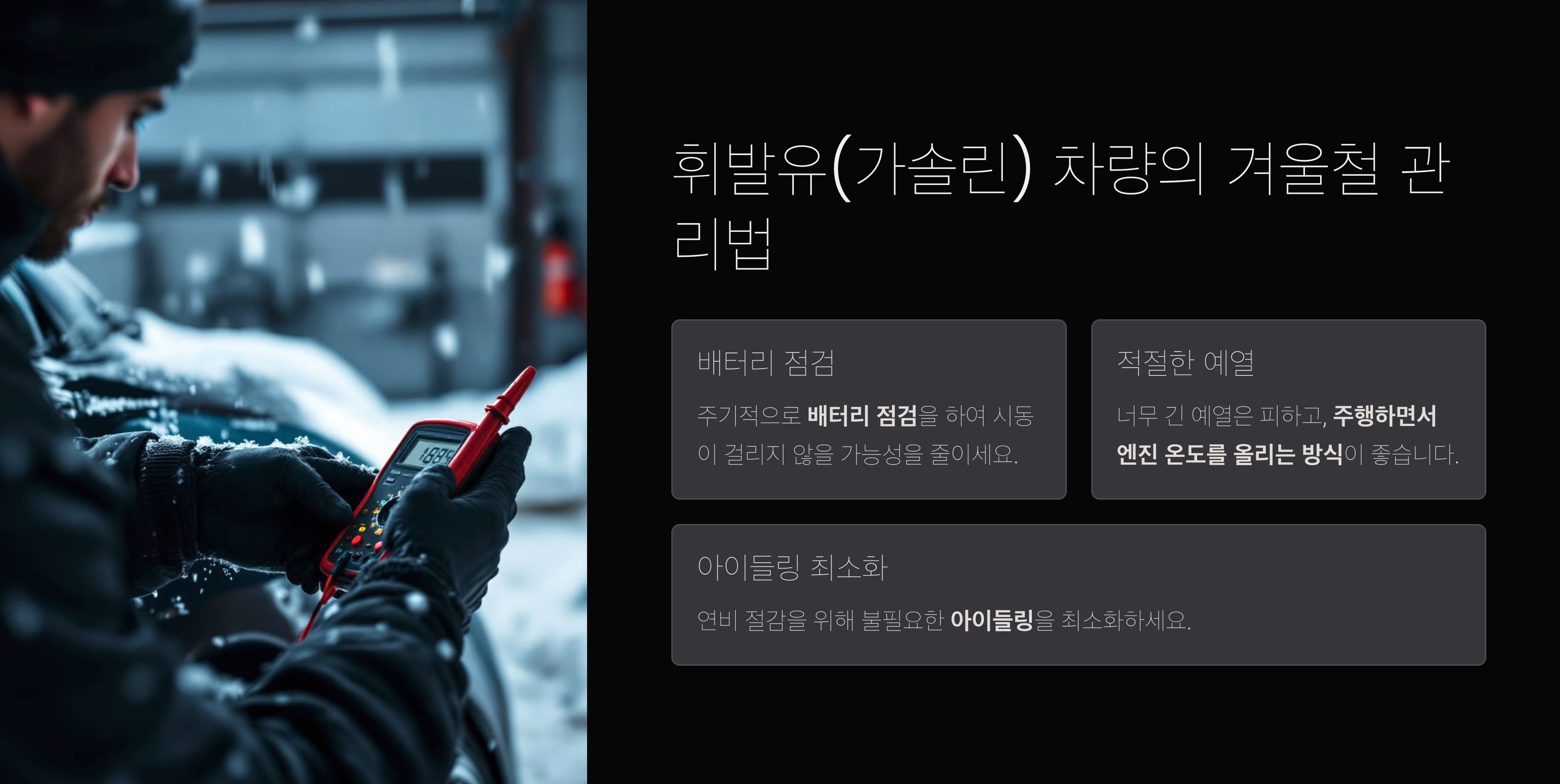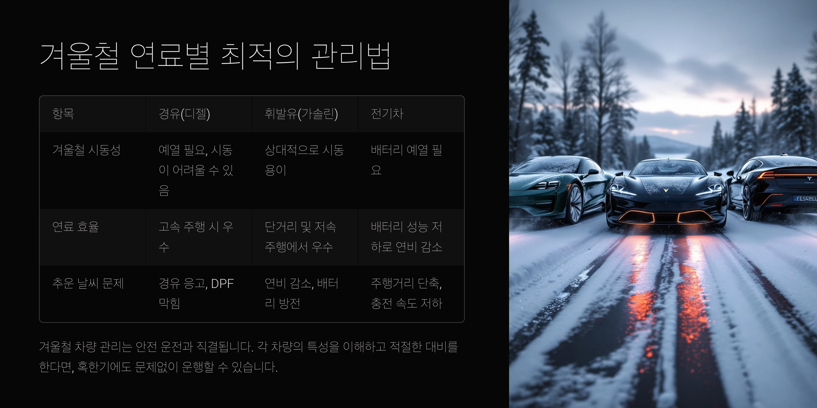 | 관리 방법 | 겨울용 연료 사용, 장거리 운행 | 짧은 예열, 배터리 관리 | 배터리 예열, 프리컨디셔닝 활용 |