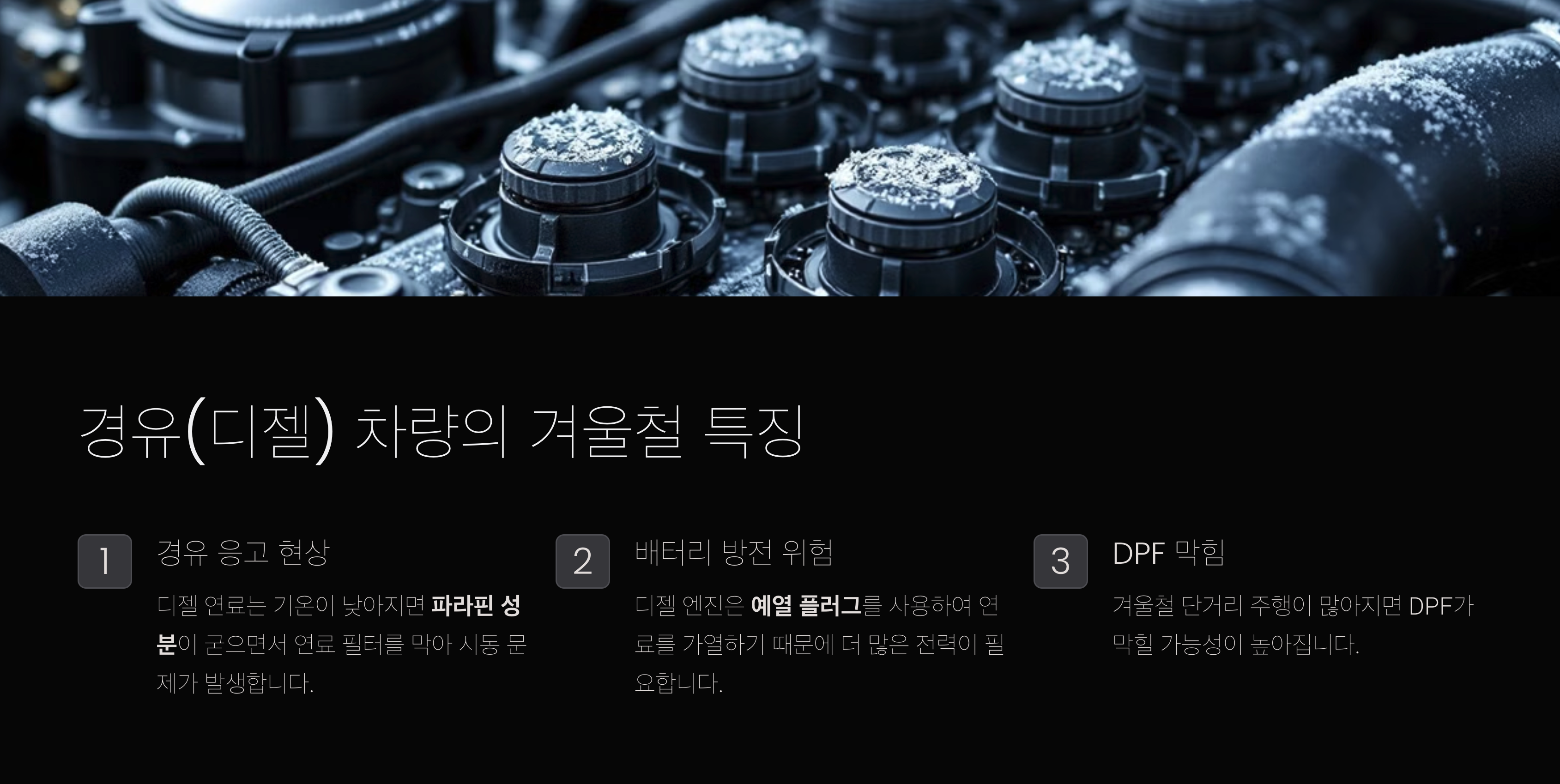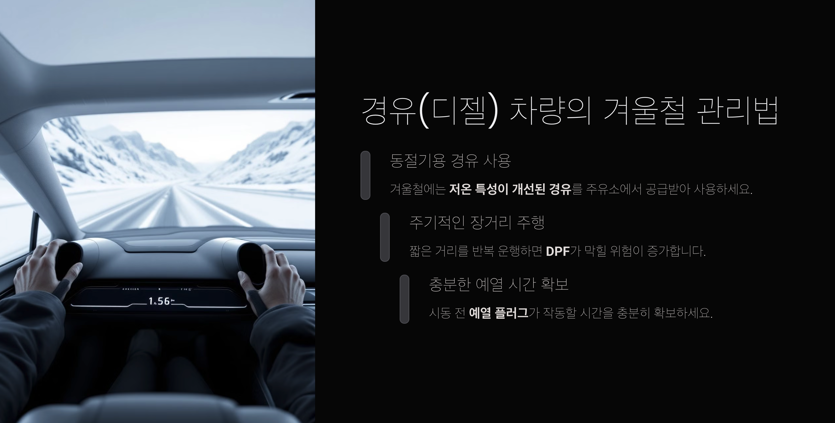 ✅ 디젤 차량: 겨울철 동결 방지를 위해 동절기용 경유 사용 및 장거리 주행 필수