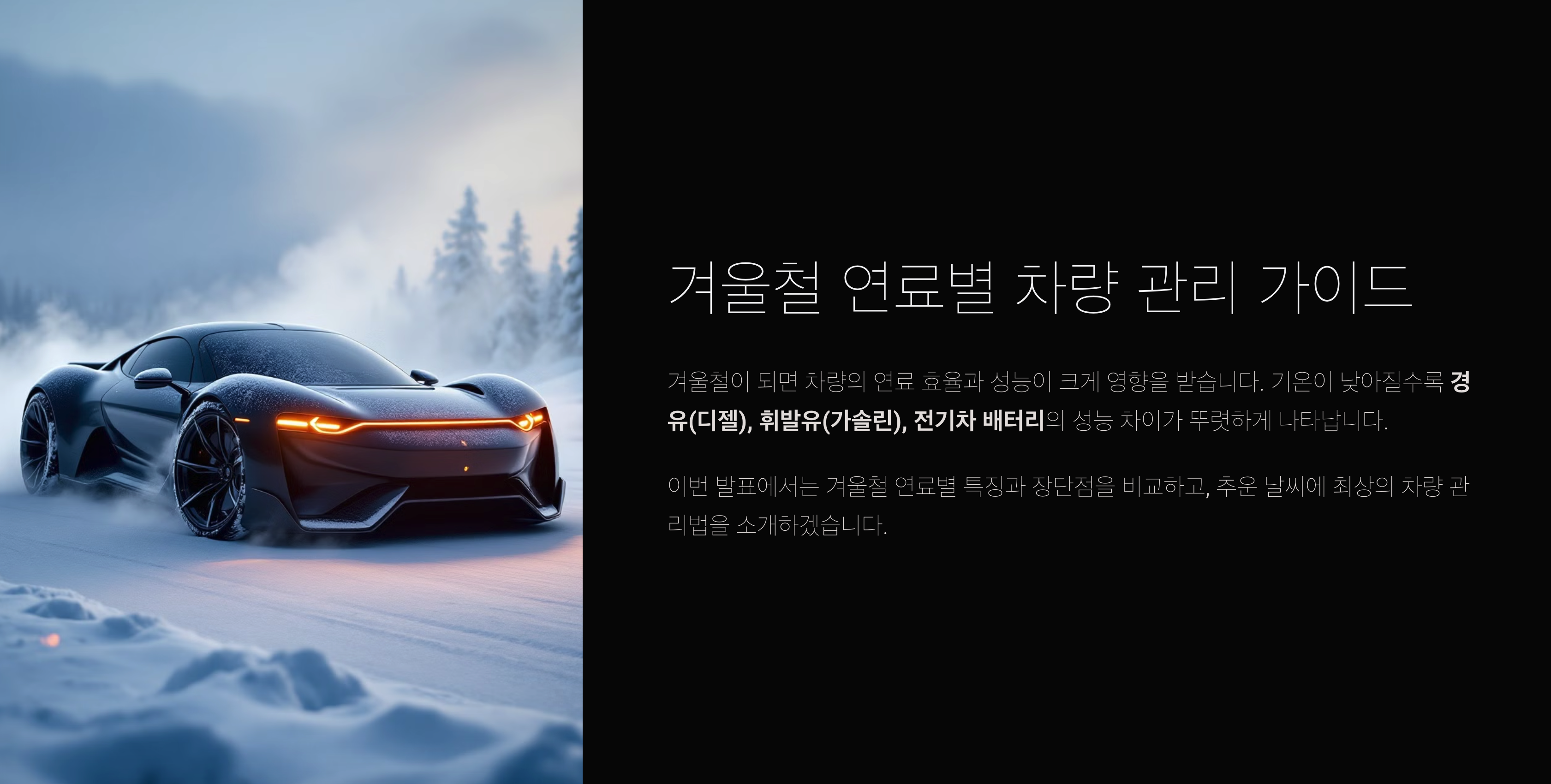 이번 글에서는 겨울철 연료별 특징과 장단점을 비교하고, 추운 날씨에 최상의 차량 관리법을 소개하겠습니다.
